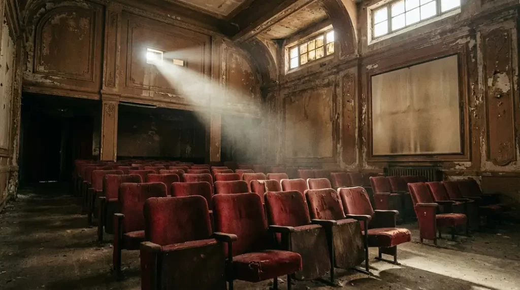 Deserted old cinema hall, dust visible in projector light beam, vintage seats, moody atmosphere, nostalgic film look, realistic textures.