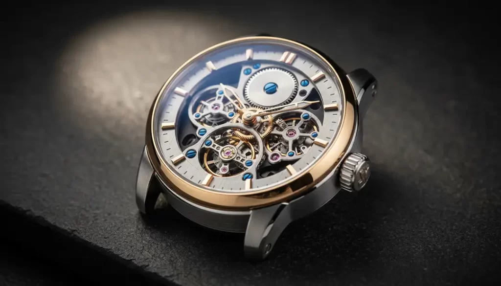 Premium cinematic product photo of a luxury watch on dark stone, controlled soft spotlight, crisp metal reflections, detailed texture, shallow depth of field, high-end commercial look.