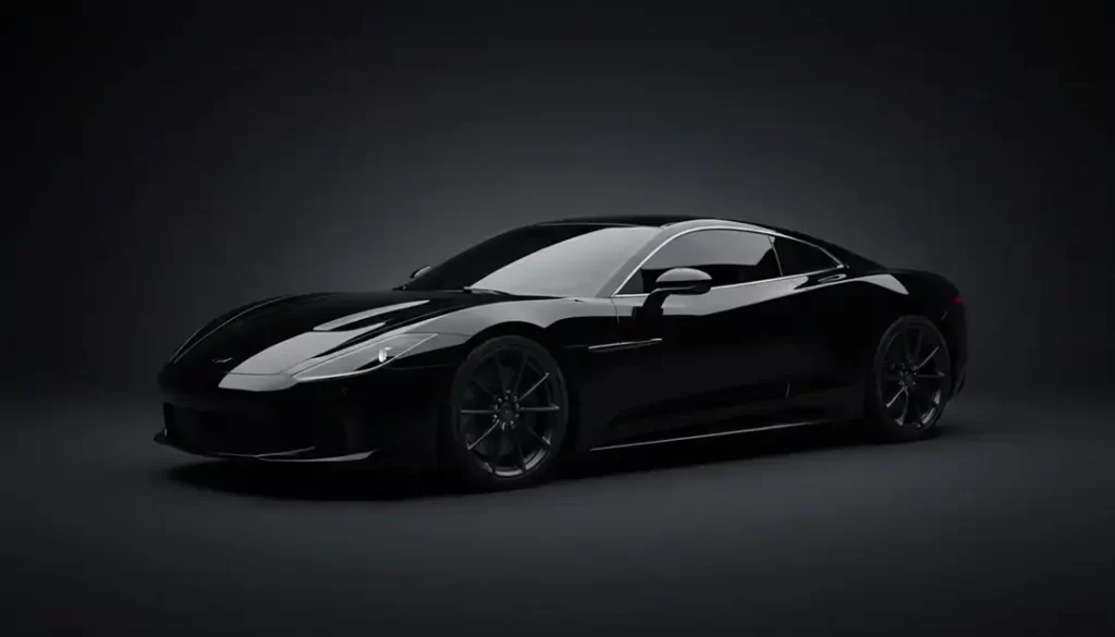 Cinematic studio shot of a black car, soft rim lights outlining curves, glossy reflections, dark background, premium commercial photography feel.