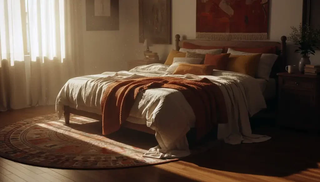 Cinematic cozy bedroom morning scene, sunlight through curtains, dust particles in light beam, warm tones, realistic fabric textures, calm mood.