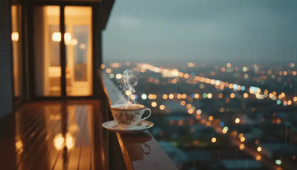 Cinematic balcony scene during rain, warm indoor light spilling out, tea cup in foreground, city softly blurred behind, gentle bokeh, peaceful mood.