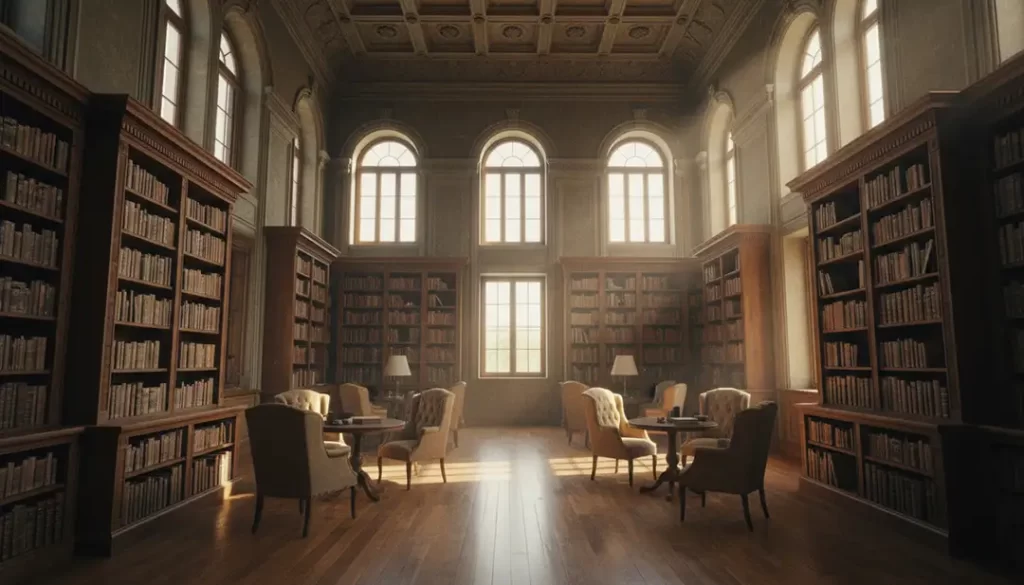 Cinematic library interior with tall windows, sun rays cutting through air, warm wood textures, dust particles, calm premium mood.