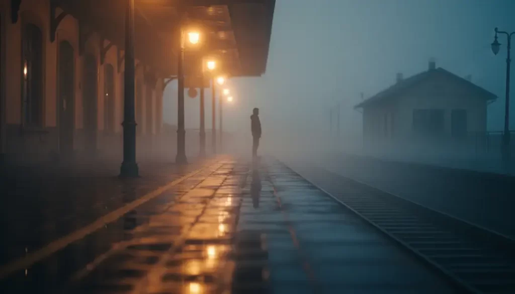 Old train platform at dusk, warm tungsten lights, light fog, traveler silhouette, cinematic composition, nostalgic film look.